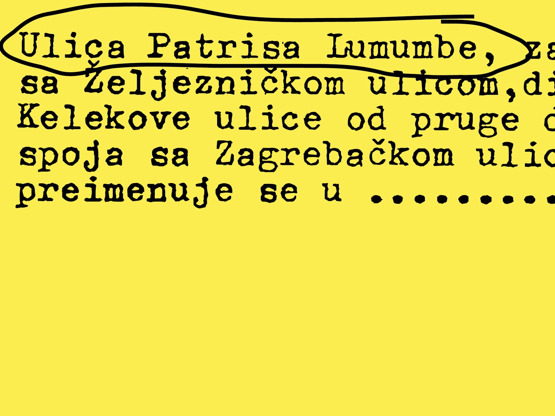 Izložba istražuje slojevitu povijest današnje Ninske ulice – jedne od ključnih urbanih osi najveće zagrebačke gradske četvrti. Polazeći od njezina razvoja od običnog poljskog puta do središnje sesvetske ulice, izložba povezuje lokalnu povijest s globalnim političkim i simboličkim kontekstom razdoblja u kojem je ulica nosila ime kongoanskog borca za dekolonizaciju i neovisnost Patricea Lumumbe. |